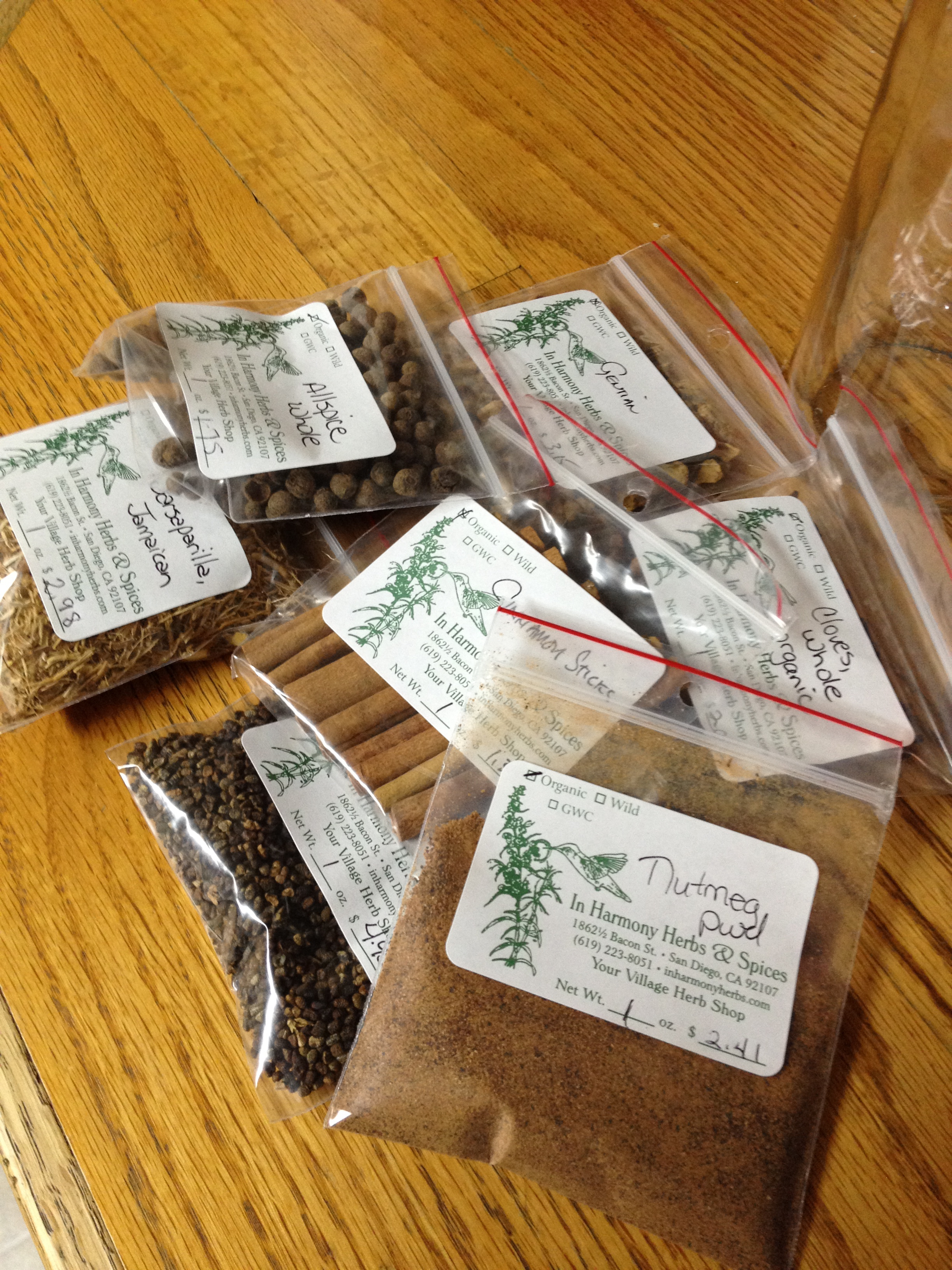 I looked up spice stores in San Diego and came across a really cool store in Ocean Beach that specializes in herbs, spices, teas and many natural remedies called In Harmony Herbs and Spices. The staff was really friendly and were able to locate the ingredients I needed in the specified amounts. I purchased 7 different ingredients for under $20. Pretty good for organic and locally grown herbs!